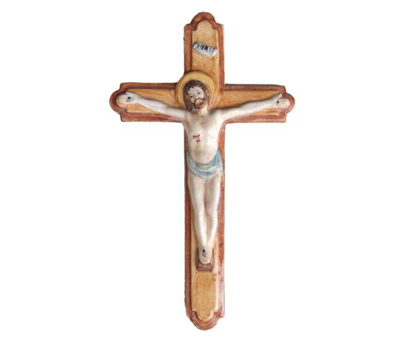 Immagine sacra in ceramica raffigurante Gesù Crocifisso, realizzata completamente a mano con l'ausilio di uno stampo, eseguita con la tecnica dell'Ingobbio. Dopo la prima cottura è stata decorata a pennello nel modo più realistico possibile, con colori nei toni del giallo, arancio e blu.