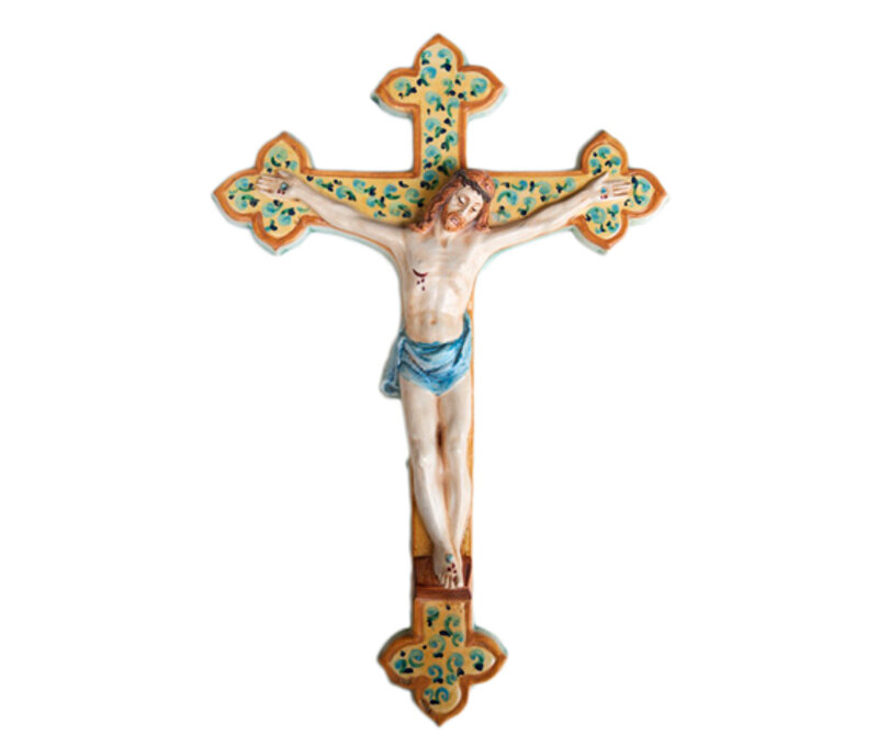 Immagine sacra in ceramica raffigurante Gesù Crocifisso, realizzata completamente a mano con l'ausilio di uno stampo, eseguita con la tecnicadell'Ingobbio. Dopo la prima cottura è stata decorata a pennello nel modo più realistico possibile, con colori nei toni del giallo, arancio e blu.